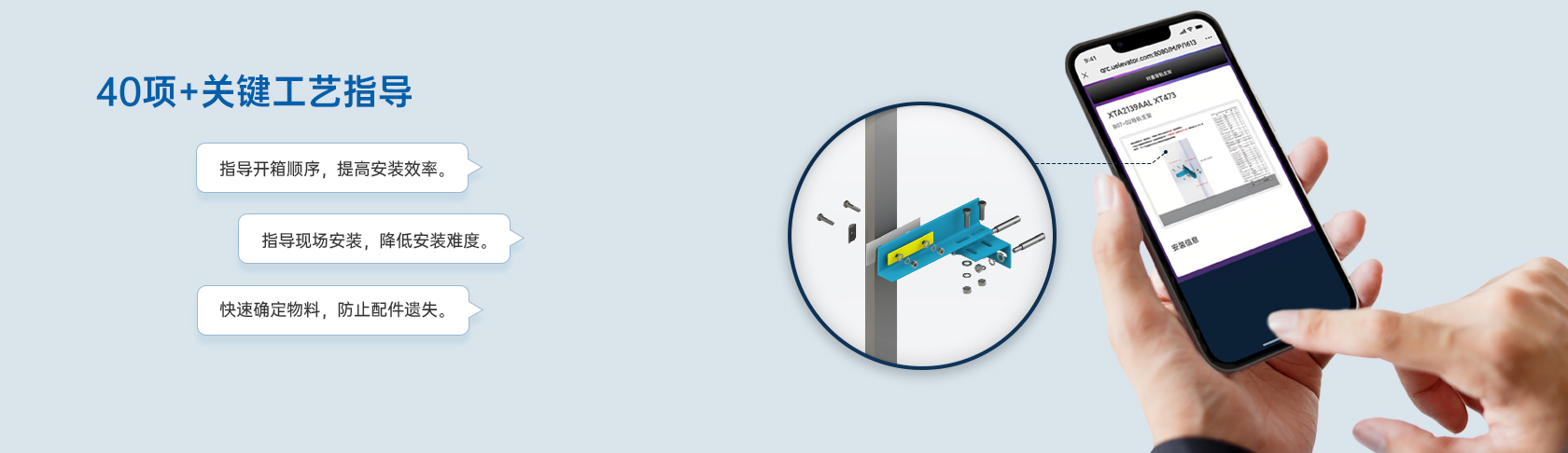 西子電梯擁有快捷的工藝指導系統(tǒng),掃碼即可查看安裝方法,提升安裝效率與安裝質量。