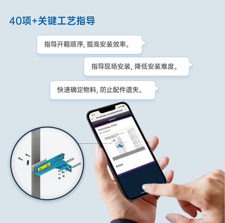 西子電梯擁有快捷的工藝指導系統(tǒng),掃碼即可查看安裝方法,提升安裝效率與安裝質量。